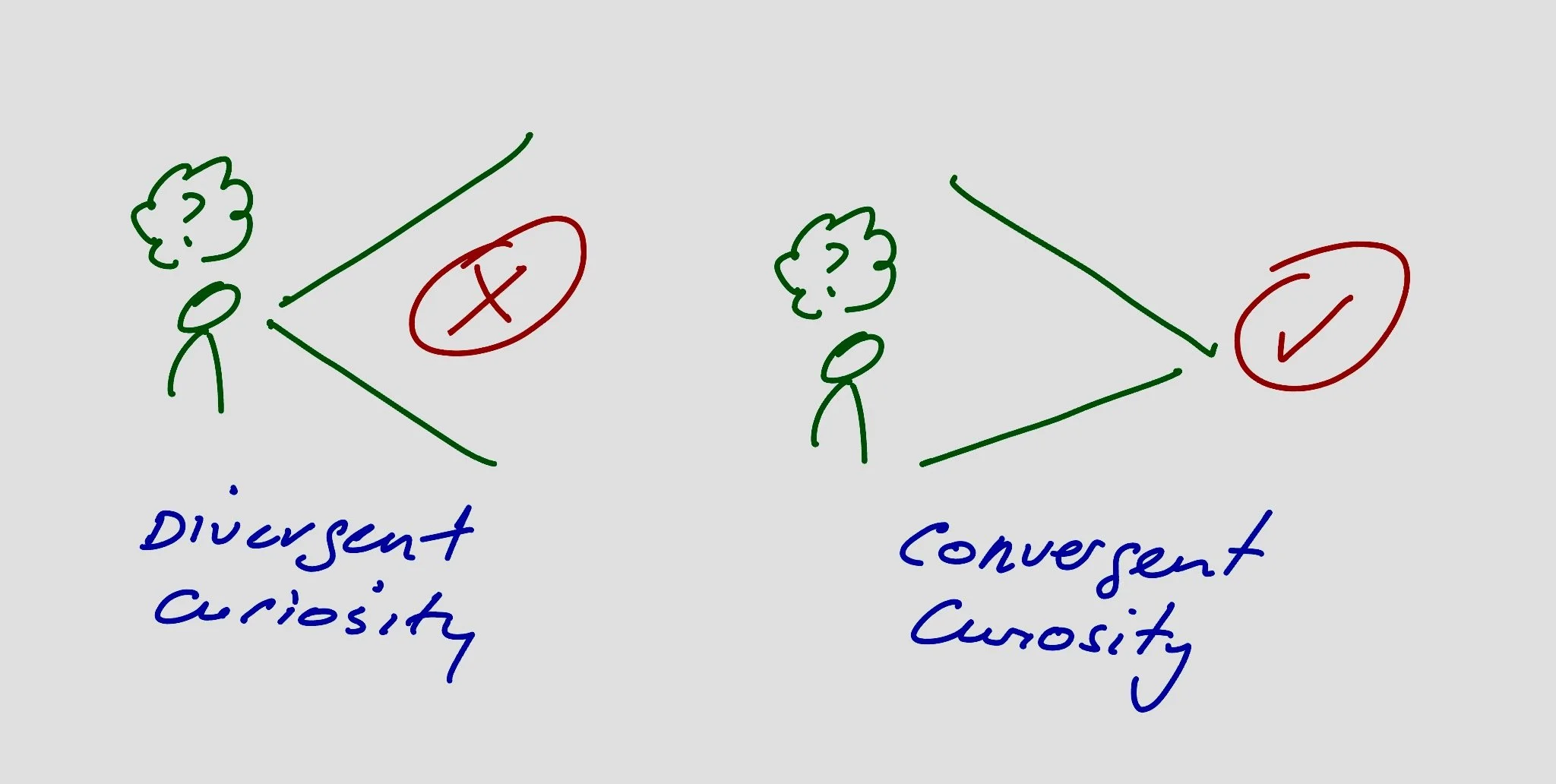 Your thoughts race between ‘hurry up, we’re on a deadline’ and ‘stop asking me questions and for the love of Pete, tell me what you think!’. Your frustration escalates while your ability to concentrate dissipates. Your boss’ divergent curiosity is incredibly valuable when you’re developing new ideas, but that’s not what you need from this conversation. You need convergent curiosity.